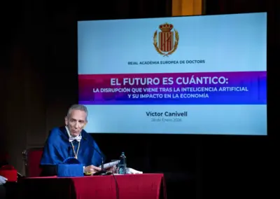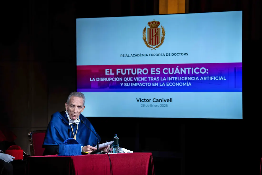 Victor Canivell, PhD in Quantum Physics, was inducted as a Corresponding Member of the Royal European Academy of Doctors (READ) during a solemn ceremony held on January 28 at Fomento del Trabajo, the Academy’s headquarters. The new academic delivered his inaugural address entitled “The Future Is Quantum: The Disruption Coming After AI and Its Impact on the Economy”, in which he argues that the world is already “quantum,” from semiconductors to magnetic resonance imaging, but that the true revolution is yet to come with quantum computing—a technology capable of exponentially increasing computing power and drastically reducing the energy consumption of data centers. He was formally welcomed on behalf of the Academy by Full Member and renowned science communicator Sònia Fernández-Vidal.